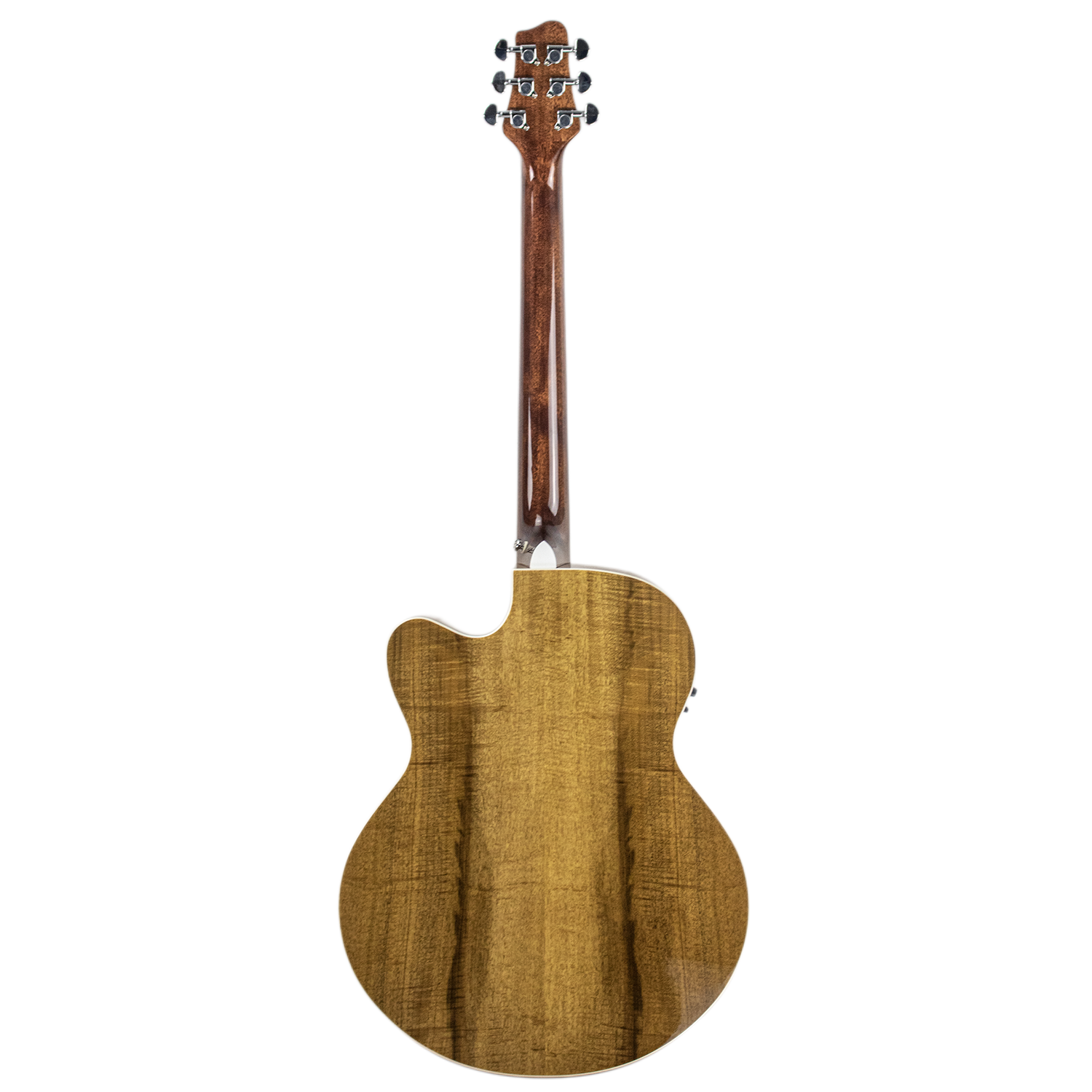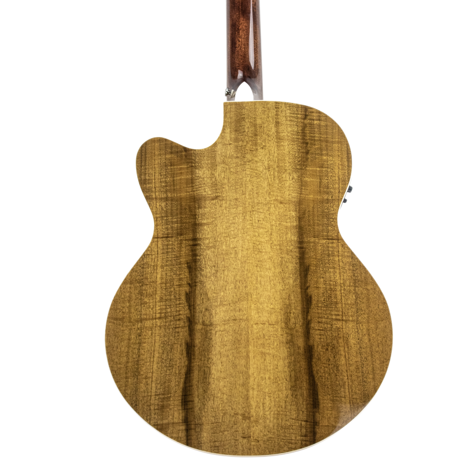An instrument built for players who want bold tone, striking visuals, and modern performance in one inspiring package. The beautiful Myrtlewood back and sides deliver a warm, clear, and balanced sound with impressive projection, while the jumbo body shape enhances low-end depth and shimmering highs. Each guitar showcases unique wood grain for a truly one-of-a-kind look. With a sleek cutaway and 24 easily accessible frets, this guitar invites you to explore the full range of the fretboard, making it ideal for expressive lead work, extended chords, and contemporary acoustic playing styles.