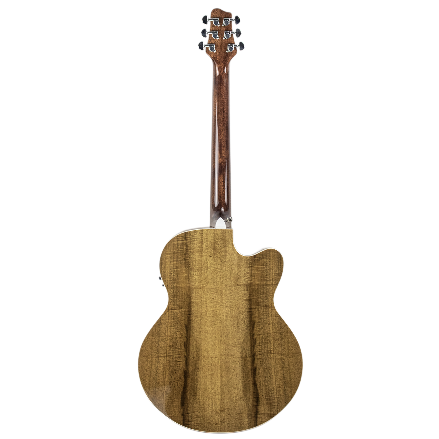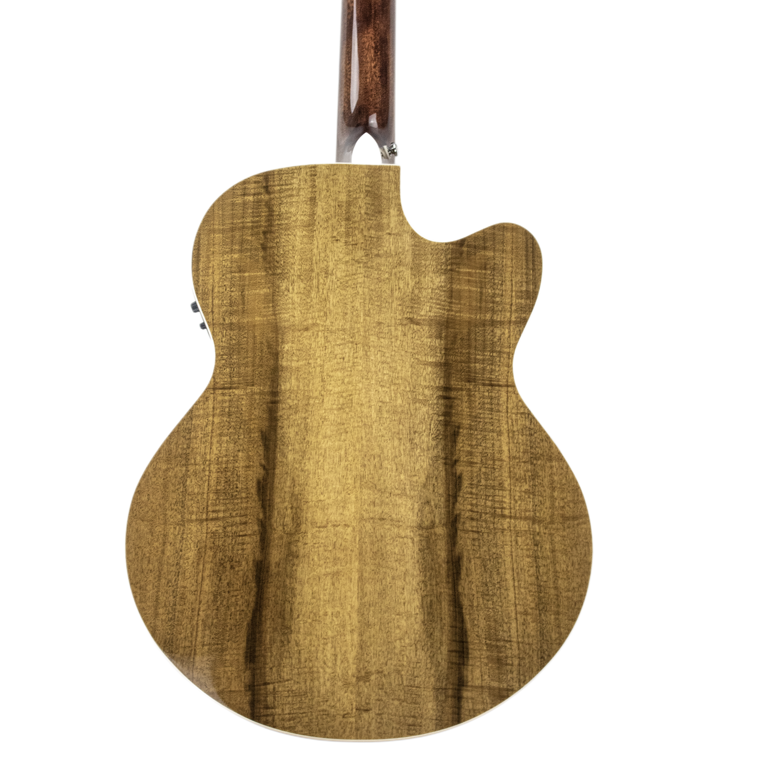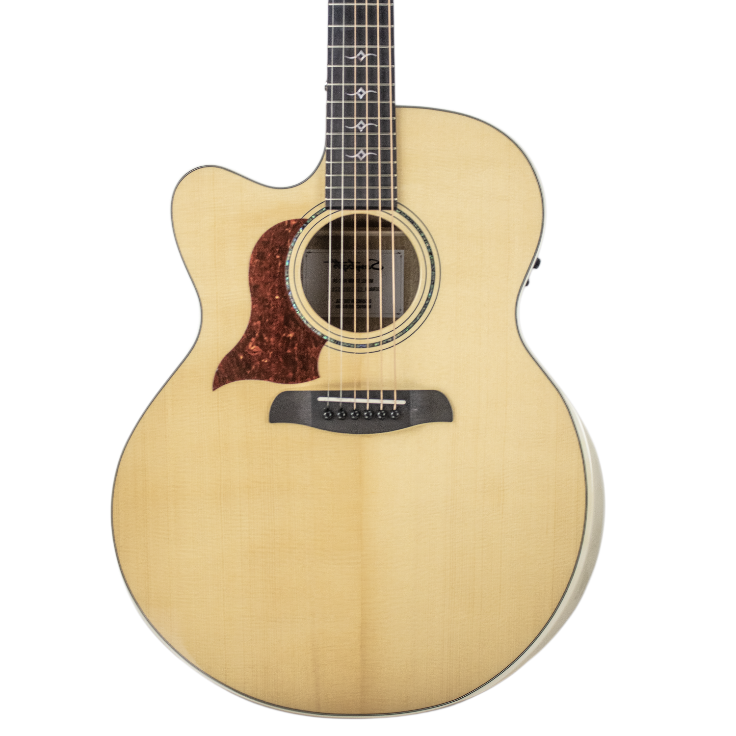 An instrument built for players who want bold tone, striking visuals, and modern performance in one inspiring package. The beautiful Myrtlewood back and sides deliver a warm, clear, and balanced sound with impressive projection, while the jumbo body shape enhances low-end depth and shimmering highs. Each guitar showcases unique wood grain for a truly one-of-a-kind look. With a sleek cutaway and 24 easily accessible frets, this guitar invites you to explore the full range of the fretboard, making it ideal for expressive lead work, extended chords, and contemporary acoustic playing styles.